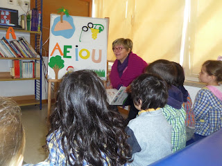 Durante o mês de fevereiro e em momentos diferentes, os três grupos das crianças do Jardim de Infância de Alcains deslocaram-se à Biblioteca Escolar da EB1, onde puderam ouvir e assistir à dinamização da História das cinco vogais, de Luísa Ducla Soares e Manuela Bacelar (Edições Afrontamento). No âmbito do Plano Anual de Atividades do departamento curricular, cujo tema foi, este mês, a “viagem ao mundo das letras”, as crianças contactaram com as vogais maiúsculas e minúsculas, fizeram jogos de sons - evocação fonética, associação, correspondência - e o jogo do dado das vogais. A atividade foi enriquecida com a audição de canções alusivas ao tema e propostas de trabalho para desenvolvimento em contexto de sala de atividades.