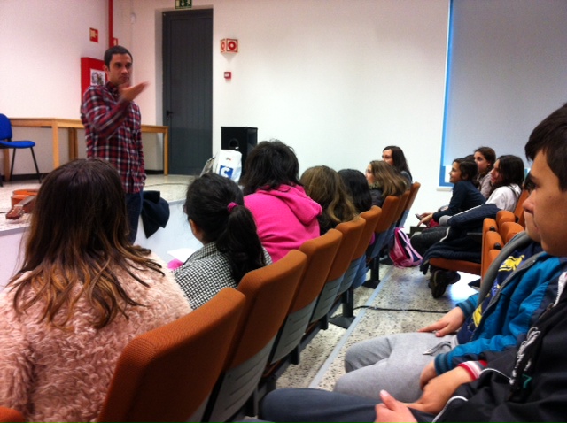 Esta tarde os alunos do 5.º e do 6.º ano da escola-sede do Agrupamento foram presenteados com duas sessões de leitura muito especiais. Não é todos os dias que um escritor nos visita e nos conta histórias. Ainda por cima com a expressividade e a capacidade de captar a nossa atenção que Sandro William Junqueira mostrou hoje. Foram duas sessões animadas, que envolveram música, canções, leitura, recitação, tudo misturado em duas horas bem passadas em torno de dois dos livros que pertencem às Metas Curriculares da disciplina de Português do 2.º Ciclo: A viúva e o papagaio, de Virginia Woolf, e As naus de verde pinho, de Manuel Alegre. Foi a oportunidade de ficarmos a saber mais sobre os livros e a criar ainda mais vontade de os ler e interpretar. No fim houve uma canção em conjunto, uma troca de impressões e uma sessão de autógrafos improvisada. Ficamos já à espera de uma próxima visita.