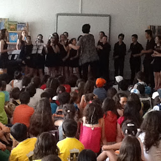A semana do Agrupamento não deixou de fora a Biblioteca Escolar da sede. Aqui decorreu a sessão de abertura no dia 3 de junho e também aqui se realizou, na manhã do último dia de festejo, uma belíssima apresentação do coro dos alunos do Ensino Articulado, conduzido pela Professora Mónia Roxo. A sala estava cheia de crianças do 1.º Ciclo do Ensino Básico, que apreciaram muito este momento musical, que terminou com uma peça bem do seu agrado e que muitos reconheceram do filme Toy Story.